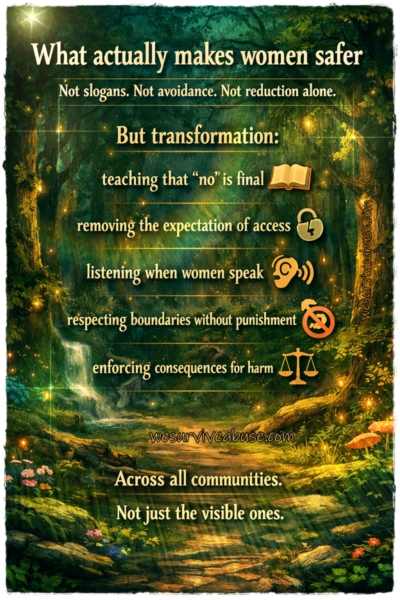 • The expectation that women should absorb harm and violence quietly